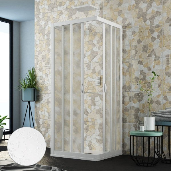 APERTURA AD ANTA SCORREVOLE SU CUSCINETTI.PROFILI IN PVC COLORE BIANCO PASTELLO.CHIUSURA MAGNETICA.RIDUCIBILE TAGLIANDO I BINARI DI SCORRIMENTO.REVERSIBILE.ESTENSIBILITÀ PER LA REGOLAZIONE AL PIANO D'APPOGGIO.SISTEMA DI FISSAGGIO IN ACCIAIO INOSSIDABILE.PANNELLI IN ACRILICO(FANTASIA BOLLE)SPESSORE 2,2MM.ACCESSORI IN ABS. NON ABBINABILE AL LATO FISSO O PARETE FISSA MODELLO ACRIL. L'INGRESSO SI RIDUCE PROPORZIONALMENTE IN CASO DI RIDUCIBILITÀ.