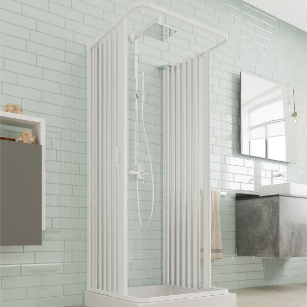 CABINA DOCCIA TRE LATI CON APERTURA A SOFFIETTO CENTRALE. CON CHIUSURA MAG NETICA. REVERSIBILE E RIDUCIBILE. PROFILO BIANCO PASTELLO. PANNELLO ONDULATO IN PVC MILLERIGHI. ALTEZZA BOX DOCCIA 188CM. MANIGLIA IN E PROFILO IN PVCACCESSORI IN ABS. RIDUCIBILE A QUALSIASI MISURA TAGLIANDO IL BINARIO DI SCORRIMENTO. SCORRIMENTO SU PATTINI.