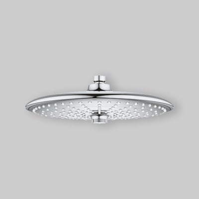 Getti: Rain, SmartRain, Jet. Soffione: Ø 260 mm. Raccordo a sfera con angolo di inclinazione orientabile ± 15°. Raccordo da 1/2". GROHE DreamSpray per un getto sempre perfetto. GROHE Long-Life, finitura resistente. Sistema anticalcare SpeedClean. Inner Water Guide, canale interno dedicato al passaggio dell'acqua che garantisce affidabilità nel tempo. Adatto per scaldabagni istantanei